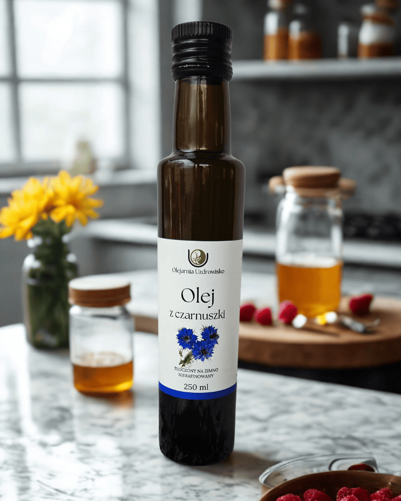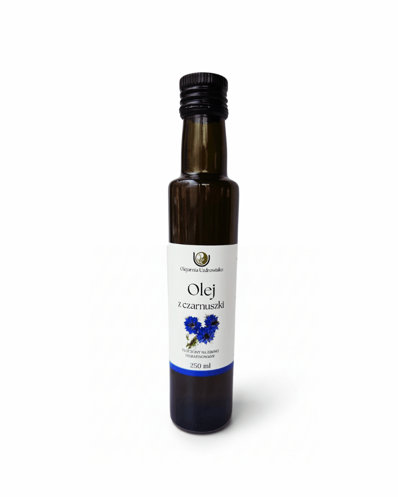 Olej z czarnuszki w naszej Olejarni Uzdrowisko powstaje z najwyższej jakości nasion czarnuszki siewnej, tłoczonych na zimno, w małych partiach, aby zachować pełnię wartości odżywczych, aromat i świeżość.