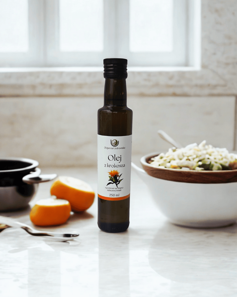Olej z krokosza w naszej Olejarni Uzdrowisko powstaje z najwyższej jakości nasion krokosza barwierskiego, tłoczonych na zimno, w małych partiach, co pozwala zachować wszystkie wartości odżywcze, świeży aromat i naturalny, złocisty kolor oleju.